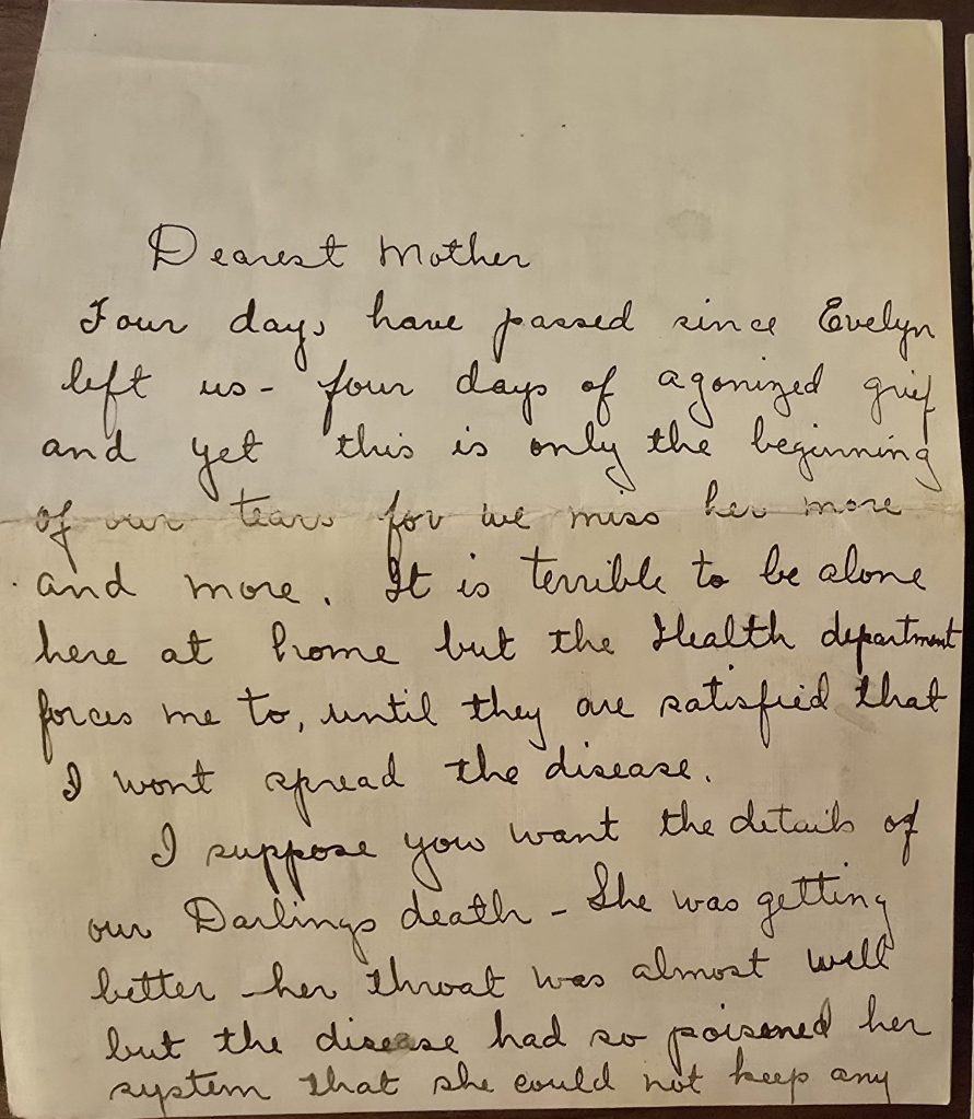 Four days have passed since Evelyn left us—four days of agonized grief and yet this is only the beginning of our tears for we miss her more and more. It is terrible to be alone here at home but the Health Department forces me to, until they are satisfied that I won’t spread the disease.
